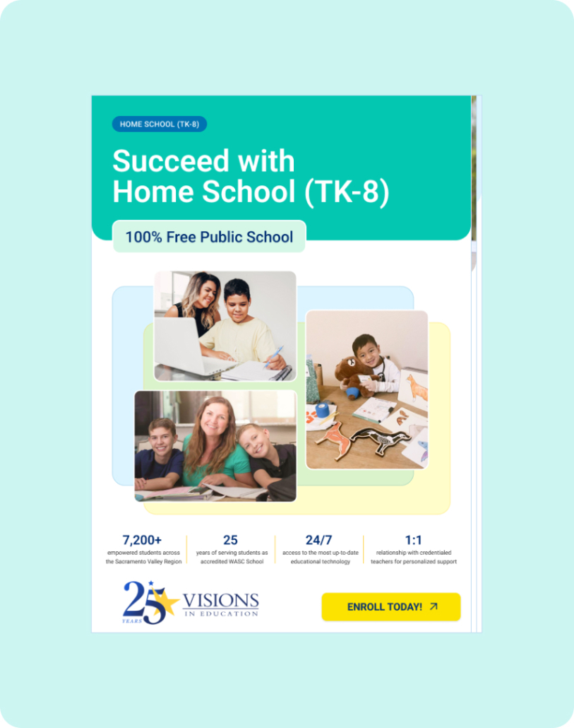 In our Home School Academy (grades TK-8), parents and guardians can support their students’ educational goals by providing the primary delivery of academic instruction in the home. We partner with families to offer flexibility and support allowing them to provide their children with a high quality education.