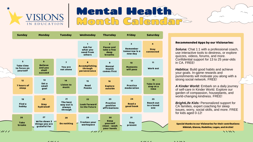 Special thanks to Empowering Voices club members Nikkiah, Gianna, Madeline, Logan and Archie for their calendar tips and insight into the many aspects of mental health awareness. Stay tuned for more Mental Health Awareness content and resources throughout the month!